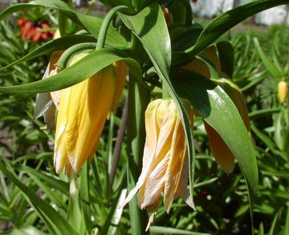 Рябчик Lutea Maxima - многолетнее травянистое растение 100-120 см высоты. Цветки очень крупные, около 6 см длины, собранные в верхушечных зонтиках, широко колокольчатые, поникающие, густо и насыщено желтые, с пучком прицветных листьев над соцветием.