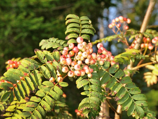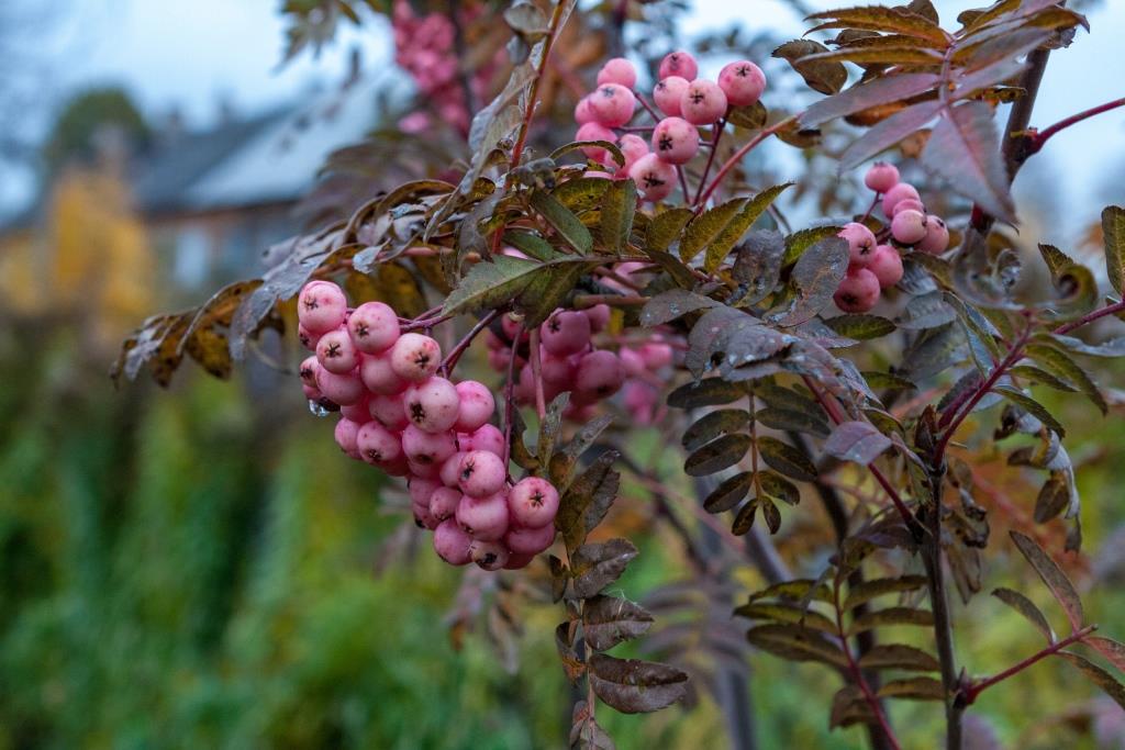 Рябина Pink Veil - декоративность данного сорта рябины заключается в плодах. Вначале ягоды имеют белый цвет, затем становятся более розовыми, а к вызреванию преобретают еще и красноватый оттенок. Высота взрослого растения до 2,5 м. Годовой прирост до 20 см,чаще до 15 см. Листья расположены очередно,непарно-перистые,края почти до основания остро-разрезанные,с верхней стороны зеленые, с нижней стороны серо-зеленые,очень слабо опушены,листовой черешок красный,осення окраска- желтая или оранжево-красная. Плоды шарорвидные или плоскоокруглые,розовые, у плодоножки и около чашечки иногда темнее,диаметром 0,8 мм.
