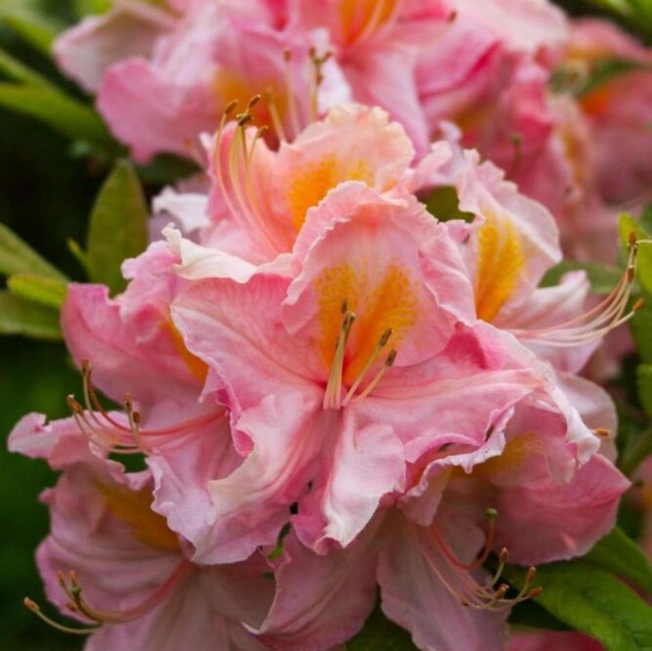 Азалия (рододендрон листопадный) Pink Delight - листопадный кустарник с густой, широкой кроной. После 15 лет достигает заявленный рост. Данный сорт устойчив к болезням и вредителям. Поливается 1-2 раза в неделю. В высоту достигает до 1,7 метра. В диаметре обычно до 1,4 метра. Цветки розовые с желтыми пятнышками 8 см в диаметре. Морозостойкость -29С.