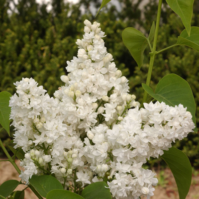 Сирень сорта «Дентель д Анжу», во взрослом возрасте становится крупномерным с глянцево - зелеными листьями сердцевидной формы.
