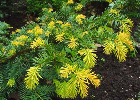 К 10 годам высота кустарника составляет: около 0,8 м., диаметр кроны: около 1 м. Максимальная высота растения: 1,2 м., максимальный диаметр кроны: 2,5 м.Хвоя: игольчатая, достаточно мягкая, длина хвоинок 2 - 3 см., ширина: 1 - 1,5 мм., при появлении хвоинки - золотисто-жёлтые, с течением времени - становятся просто жёлтыми или зеленовато-жёлтыми.
