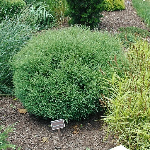 Карликовый шаровидный хвойный кустарник с ажурной кроной. Диаметр растения не превышает 0,9 м. В 10-летнем возрасте диаметр не более 0,7 м. Не требует стрижки для сохранения идеальной шарообразной формы долгое время. Хвоя нитевидная, серо-зеленая, мягкая, кружевная. Сохраняет свой цвет в зимний период, со слегка бронзовым оттенком. Предпочитает солнечные места, умеренно влажные, хорошо дренированные почвы. Рекомендована обрезка в начале весны или в середине лета для формирования формы идеального шара