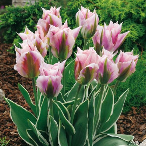 Тюльпан Chinatown - растение средней высоты. Длина стебля - 40 см. Форма цветка чашевидная. Окрас - бело-розовый с зеленым. По мере цветения практически бело-зеленый бутон розовеет. Высота бокала достигает 10 см. Листья декоративные: со светлым обрамлением. Сорт позднего срока цветения.