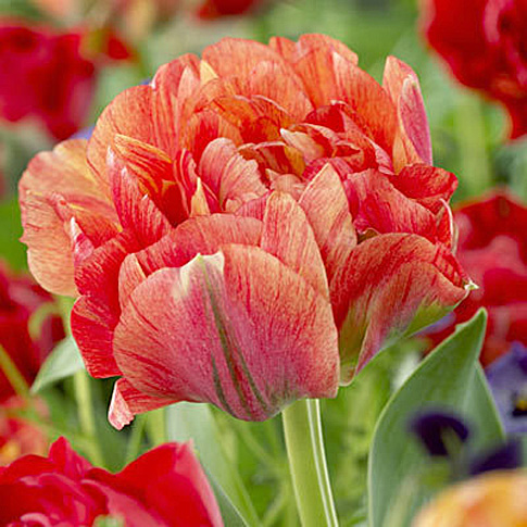Тюльпан Gudoshnik Double выделяется необычайным сочетанием желто-оранжевого и красного цветов, в сочетание с зеленоватыми прожилками. В зависимости от места расположения и освещенности все эти цвета образуют между собой множество неповторимых оттенков, а большое количеством лепестков в бутоне, напоминающим пион, создают настоящий художественный шедевр. Высота тюльпана – 45-50 см, диаметр цветка – 8-10 см, сроки цветения – май. Сорт средней силы роста. Используется для озеленения, клумбовой посадки и для срезки.