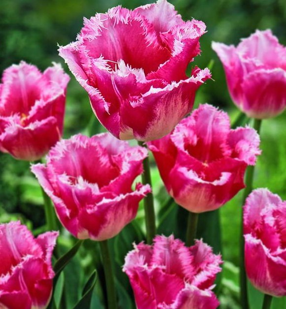Тюльпан Izumi - сорт среднего срока цветения. Высота растения 45 см. Листья темно-зеленые. Цветение в апреле-мае. Цветок крупный, чашевидный, бахромчатый, яркий, бело-розовый, с белой иголчатой бахромой.
