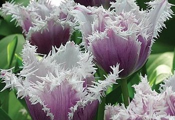 Тюльпан Kyumens - очень красивый и привлекательный сорт. Высота растения 45-50 см. Стебли толстые и прочные. Листья длинные, темно-зеленые. Цветок супер-красивый, крупный, бокаловидный, ярко-светло-фиолетовый, приукрашенный темно-фиолетовыми, тонкими штрихами-линиями, с шикарной, белоснежной бахромой по краям лепестков. Цветение длительное.