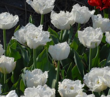 Тюльпан White Ice - очень красивый белоснежный сорт. Стебель тонкий но упругий, прямостоячий, чисто-зеленый высотой 20 см. Листья крупные, могут превышать высоту стебля, зеленые с темно-зеленым оттенком. Цветок бахромчастый, густомахровый. Лепестки снежно-белые без оттенков. Бахрома густая. Цветет сорт поздно.