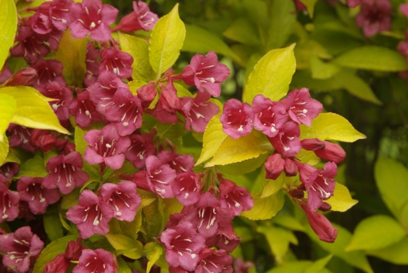 Саженцы Вейгелы Jeans Gold превратятся в кустарники, высота которых составляет 3 метра. Это растение имеет очаровательные крупные цветки темно-розового тона, иногда с белым основанием внутри. Цветения у него длится в течение целого лета и частично весны. Листья крупномера Jeans Gold приятного свеже-салатового цвета будут радовать вас до первых заморозков. Полезными плодами этот кустарник, увы, обделен, и даже декоративными их не назовешь. Вейгела Jeans Gold прихотлива в уходе – ее следует высаживать только в рыхлую и плодородную почву на постоянном солнечном свете или, в крайнем случае, в полутени. Тем не менее, отсутствия влаги она не перенесет, не смотря на любовь к высоким температурам.