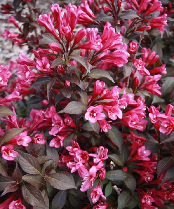 Минор Блэк вырастает до 80 см в высоту, образует широкую и плотную крону, состоящую из тонких листьев фиолетово-пурпурного, почти черного цвета. Цветки колокольчатые, красно – розовые, распускаются в мае – июне.