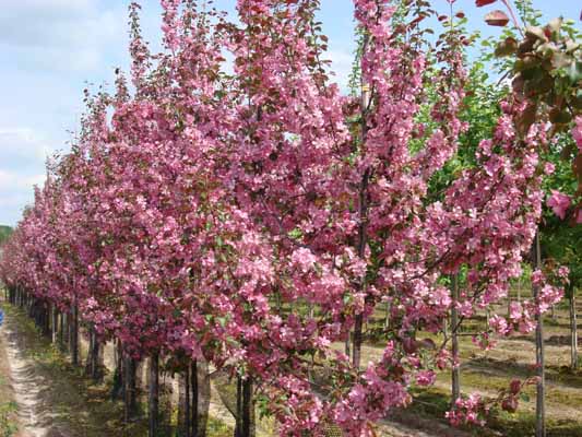 Саженцы яблони Рудольф вырастают в красивое невысокое деревце с плотной кроной из темно-зеленых листьев. Этот сорт цветет очень обильно, покрывая плакучие ветви бутонами насыщенного розового цвета. Ближе к осени на них формируются круглые плоды желтого окраса, кисловато-сладкие и терпкие на вкус. Яблоки этого крупномера долгое время хранятся на ветвях, не опадая вниз, что позволяет растению сохранять свою декоративность до самой зимы. Свои эстетические качества саженцы Рудольф проявляют лишь на обогащенных и плодородных почвах в том случае, если им будет оказан соответствующий уход.