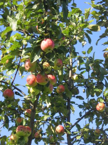 Саженцы яблони Мантет относятся к скороплодным сортам. Дерево рослое с редкой кроной и мощными ветвями. Побеги коричневого оттенка, удлиненной формы, направлены вверх. Цветки большие с бело-розовыми бутонами продолговатой формы. Плод средний, 180 г, конической формы, кожица зеленоватого оттенка, тонкая, покровный окрас – ярко-красный. Мякоть сочная, сладкая, белого оттенка.